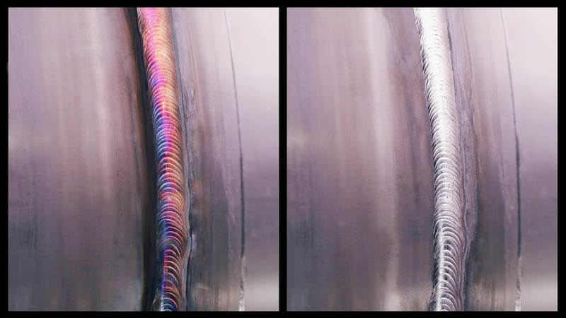 Rozsdamentes acél TIG varrat elektrolitikus tisztítás előtt (balra) és után