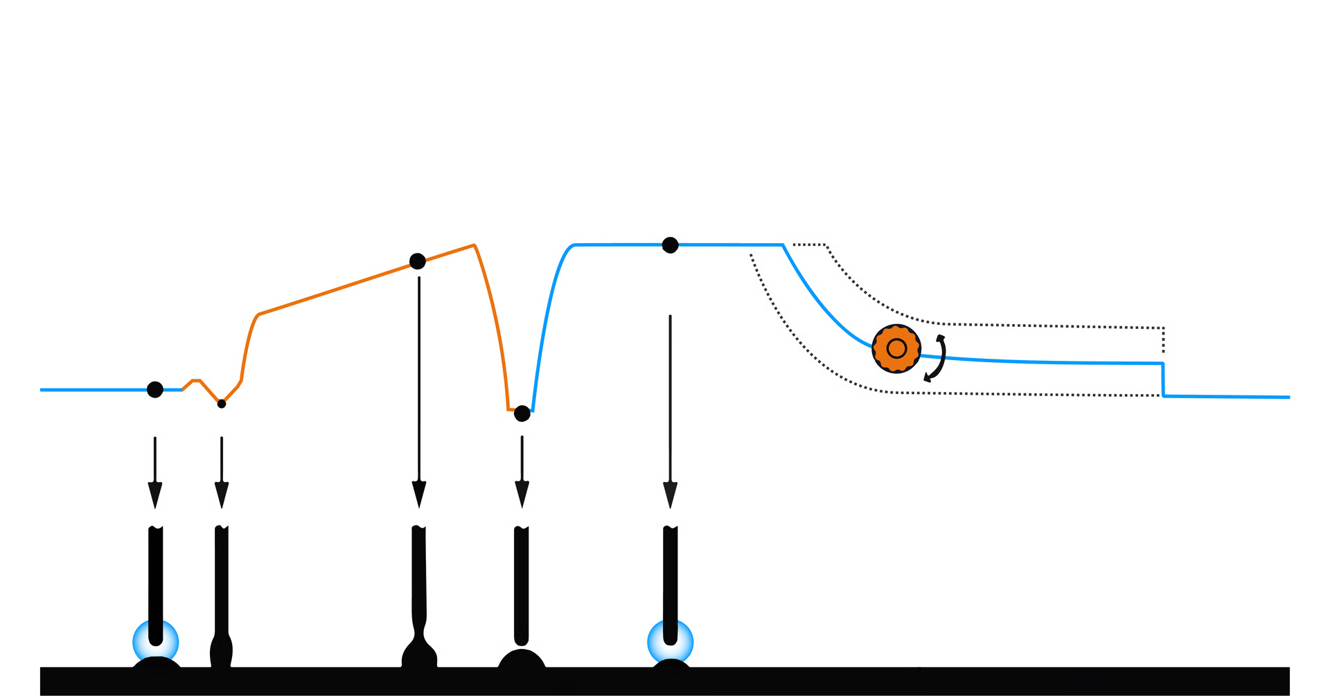 3. ábra: Az áramviselkedés és az anyagátmenet a MAX Cool eljárás során. A narancssárga szabályozó és a számértékek a hő finomhangolásának hatását szemléltetik.