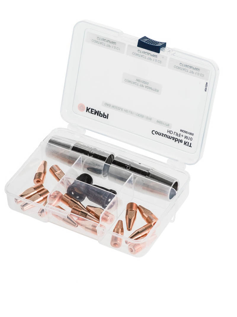 A fogyóeszközök egy strapabíró, újrahasználható tárolódobozban kerülnek csomagolásra, amely alkalmas minden fontos Flexlite MIG fogyóeszköz rendezett tárolására. A HD készlet LIFE+ áramátadó csúcsokat és nagy igénybevételre tervezett gázfúvókákat tartalmaz, kifejezetten magas áramerősségű és hosszú munkaciklusú hegesztési alkalmazásokhoz. A HD gázfúvókák nikkel bevonattal és vastagabb falakkal készülnek: – a nikkel bevonat megkönnyíti a fröcskölések eltávolítását, – a vastagabb falak növelik a tartósságot.